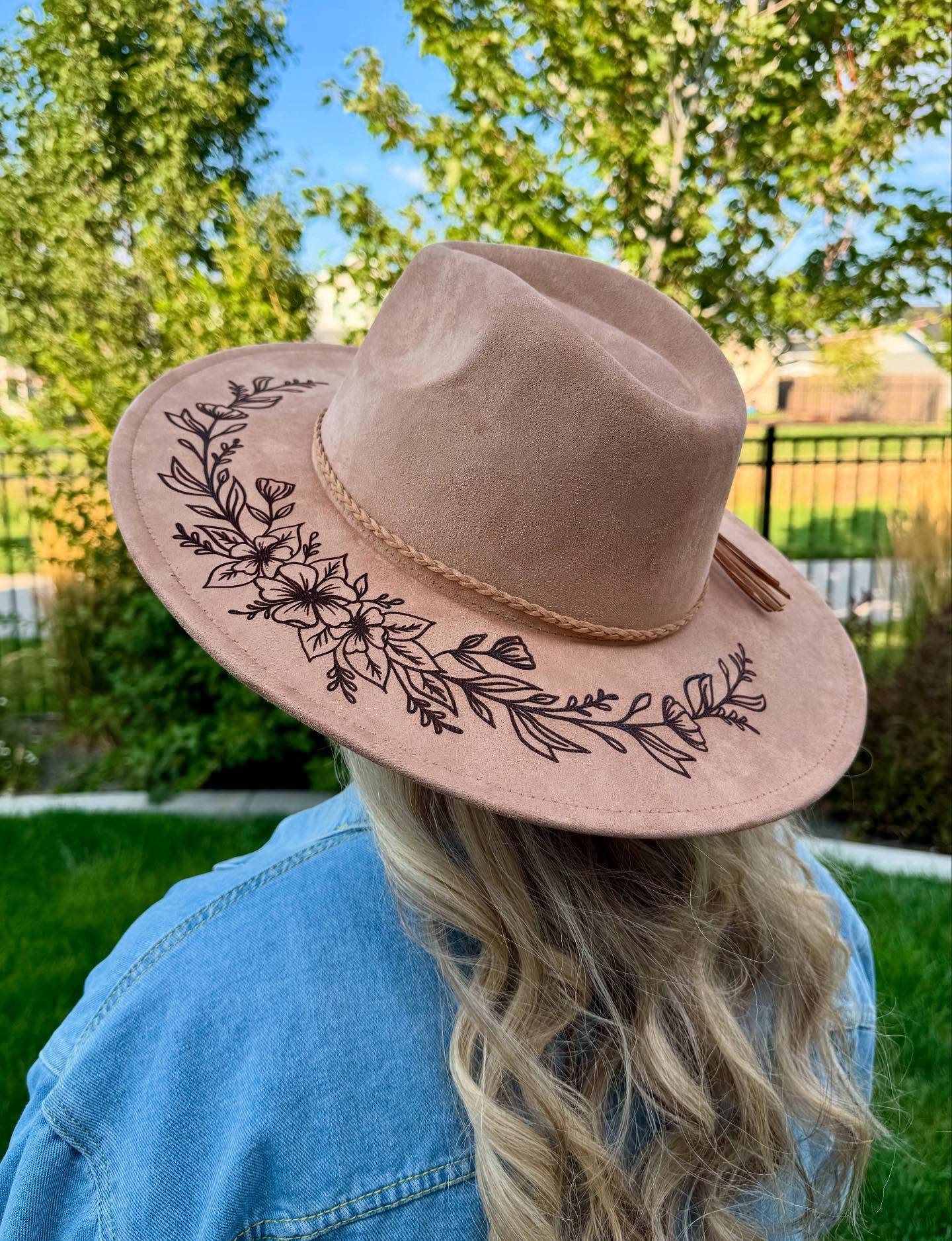 Handcrafted wide brim hats made from soft vegan suede, each featuring unique...