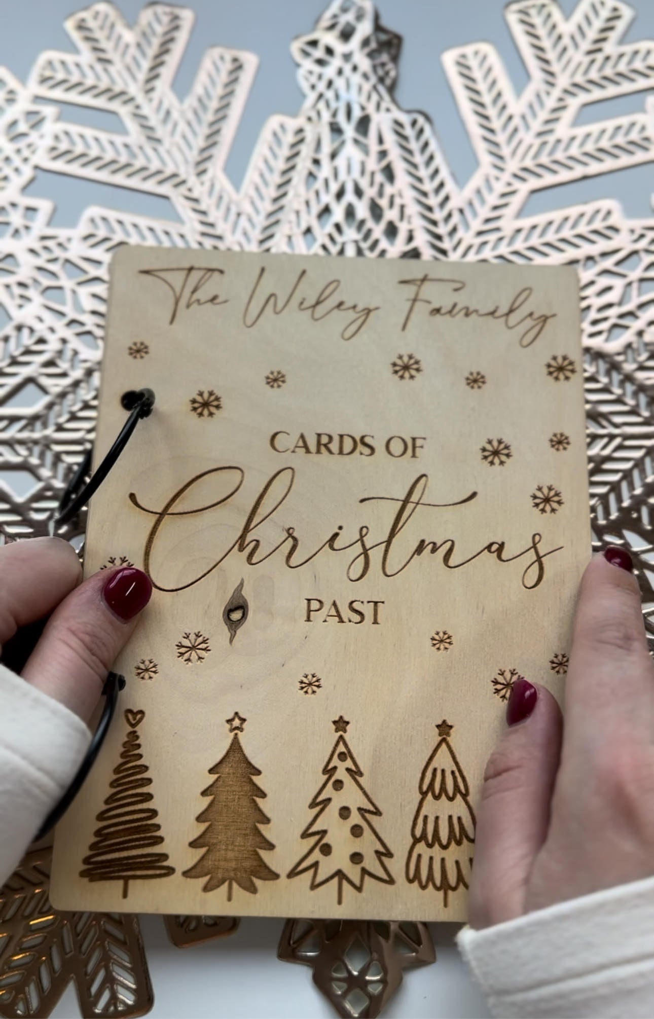 Save all your past Christmas cards in this Cards of Christmas past booklet. Personalize with your family name on top! Made from 1/8" birch and 2" black metal rings.