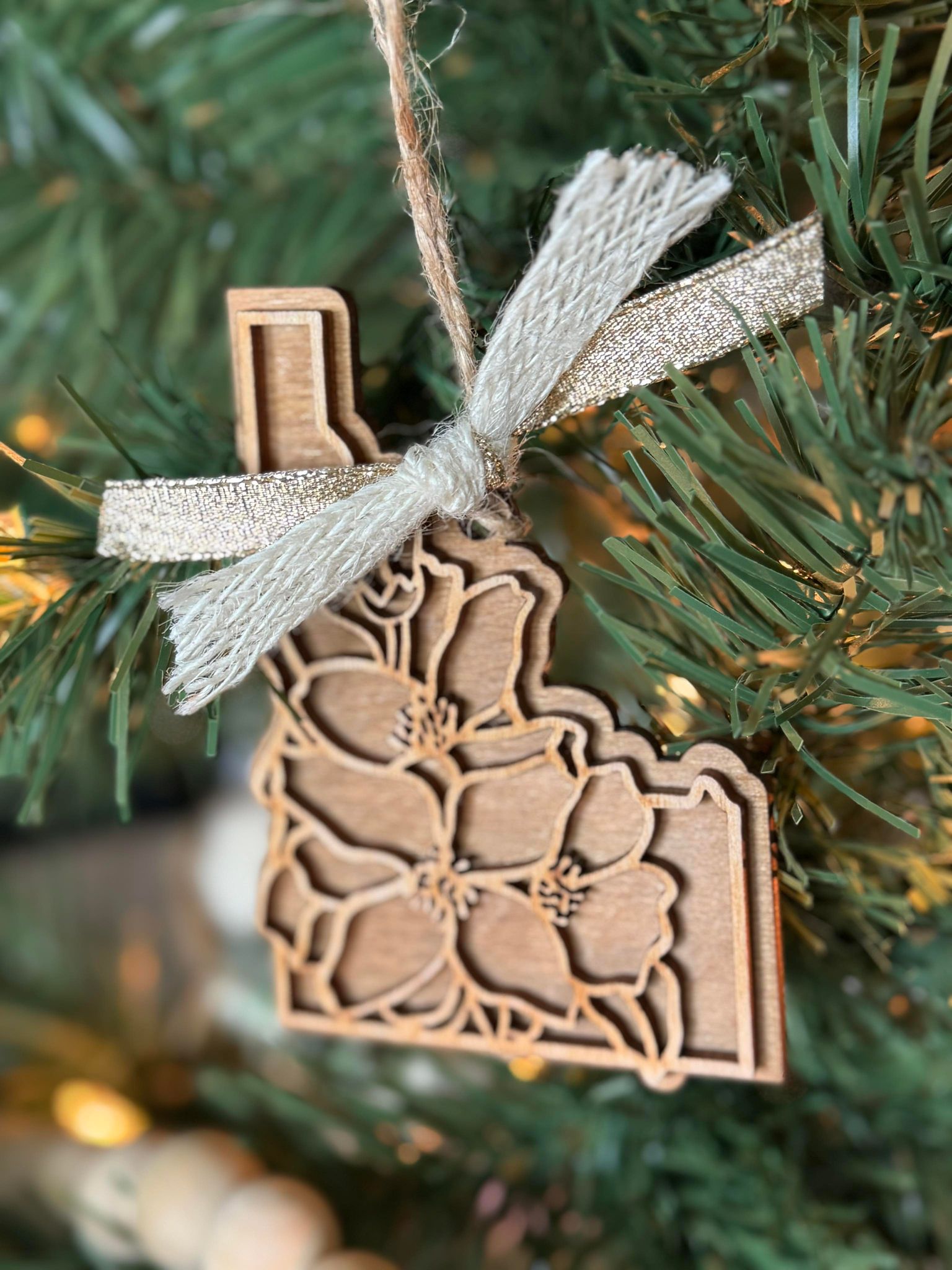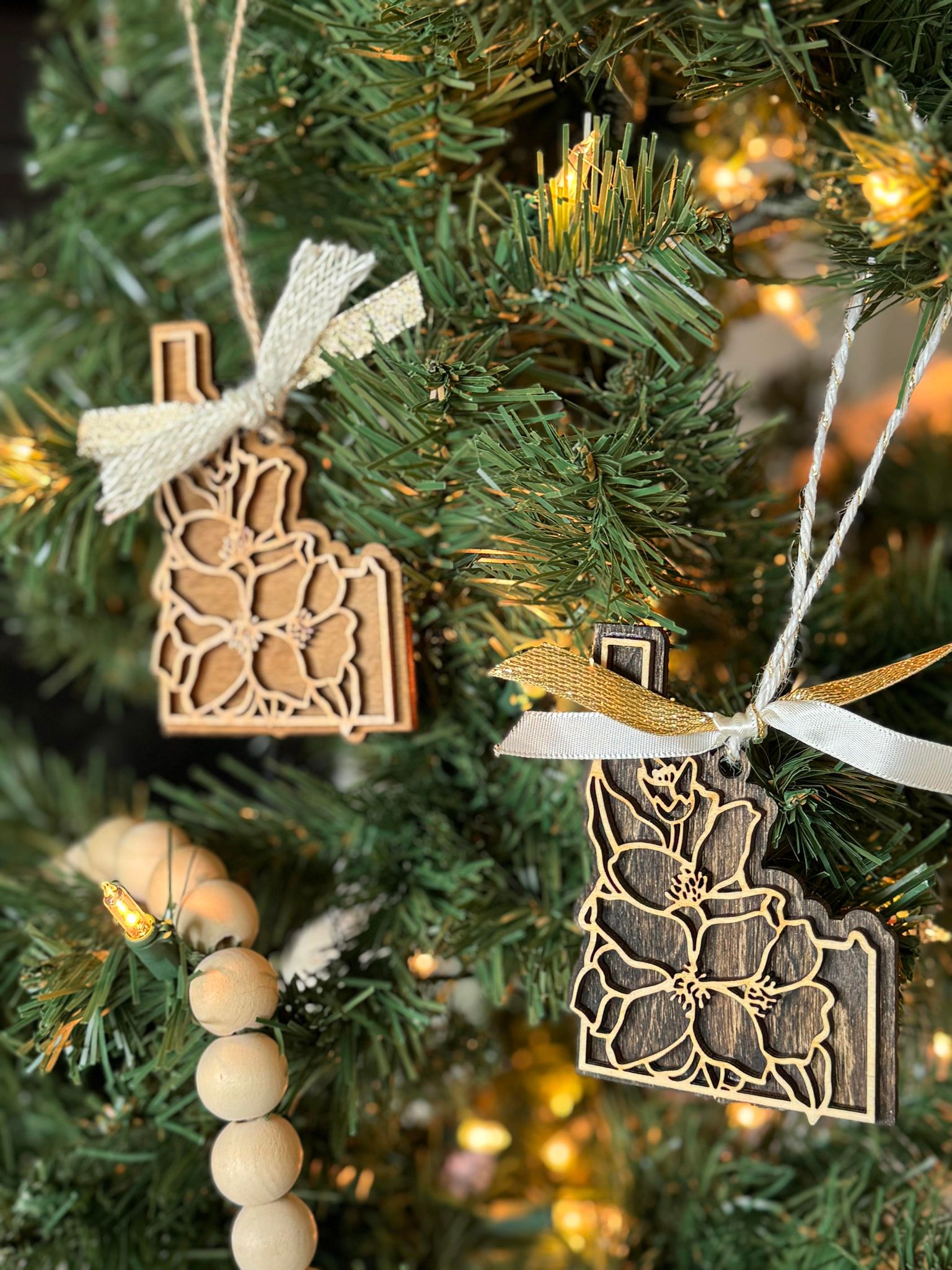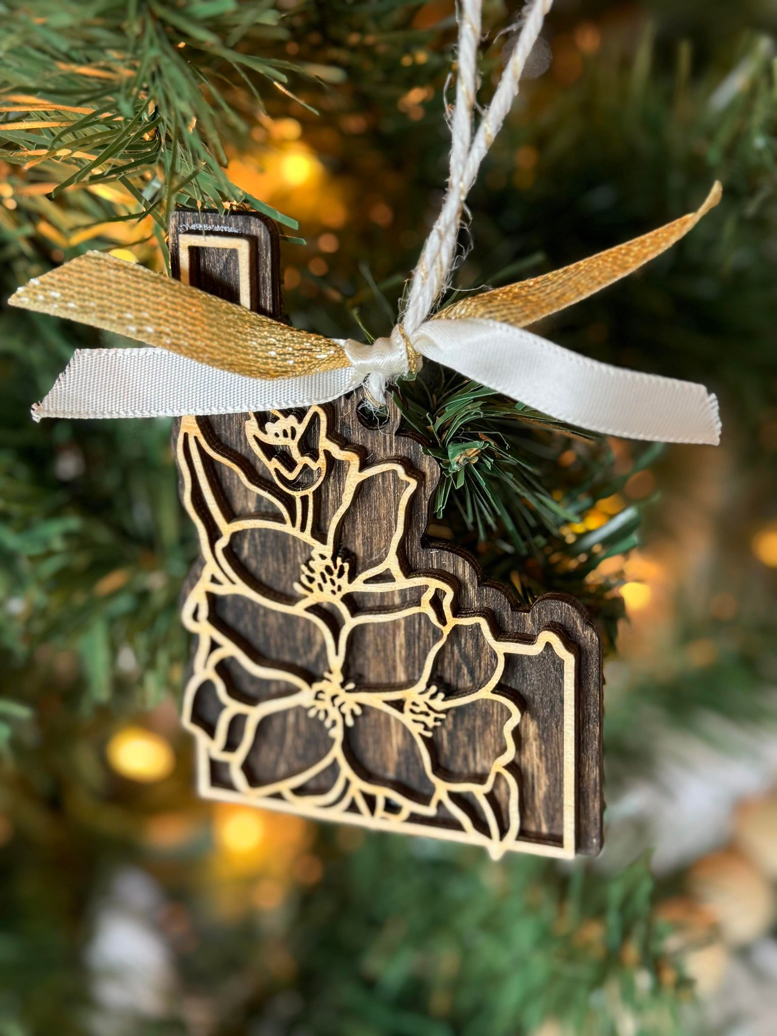 Share in our Idaho pride with this beautiful Idaho ornament. This ornament continues to be a customer favorite. Hand painted and made from 1/8" birch. Available in two color options.