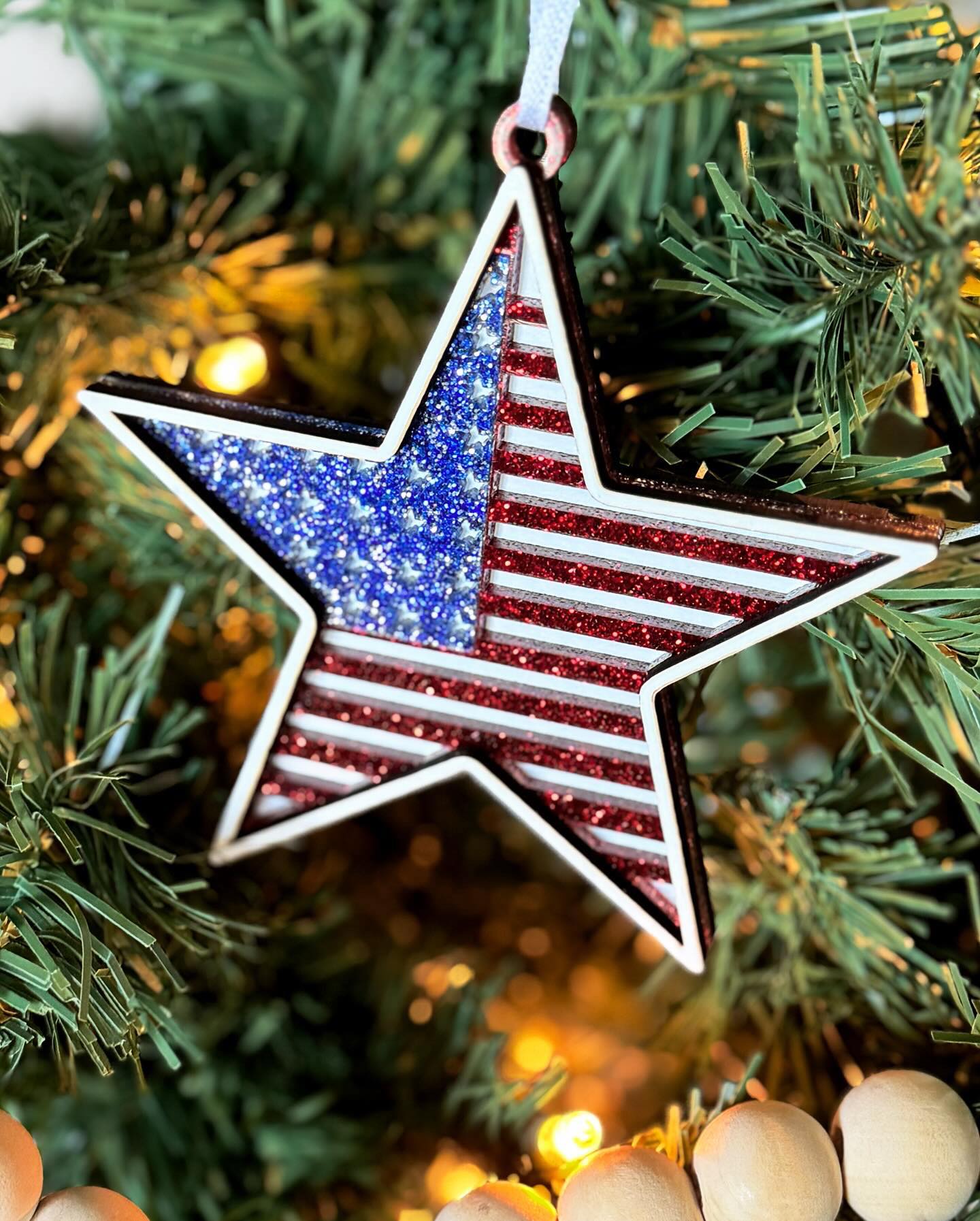 Show your American pride with this festive and patriotic star ornament. Great gift for active military or veteran friends and family. Made from 1/8" birch and 1/8" acrylic, gives these ornaments a 3D look.