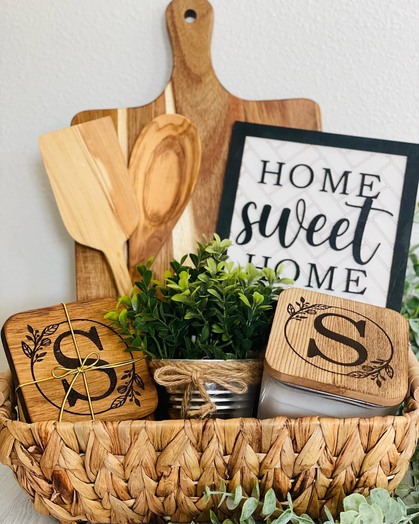 Give a basket of personalized items made specially for your client. Basket includes Acacia cutting board (16" x 9"), 4 coasters, 1 candle, 2 kitchen utensils, 6.5" kitchen sign and greenery. Four options for kitchen sign sayings. Basket can include a bottle of wine/champagne upon request.