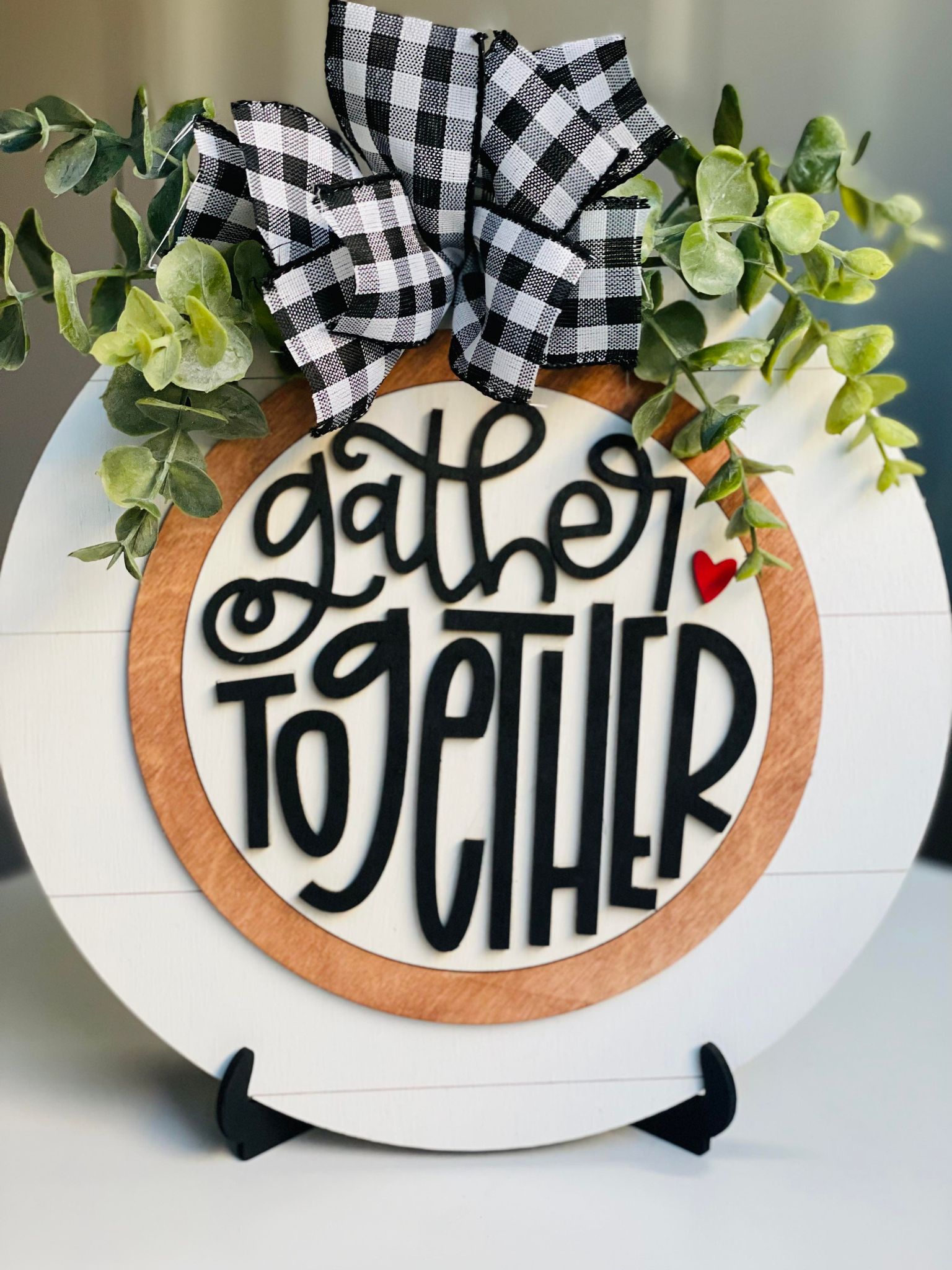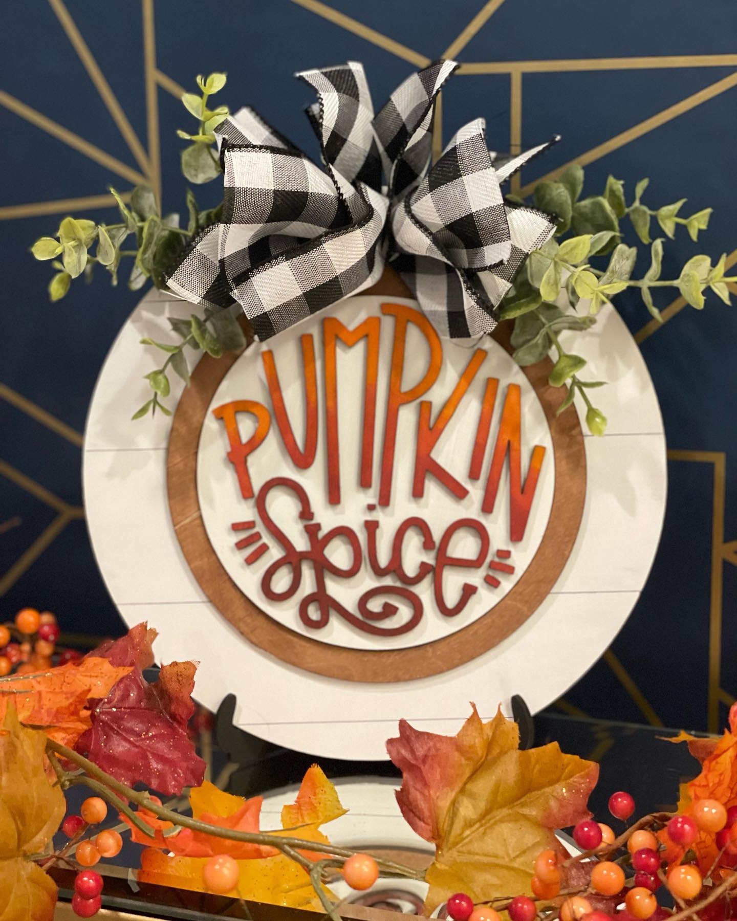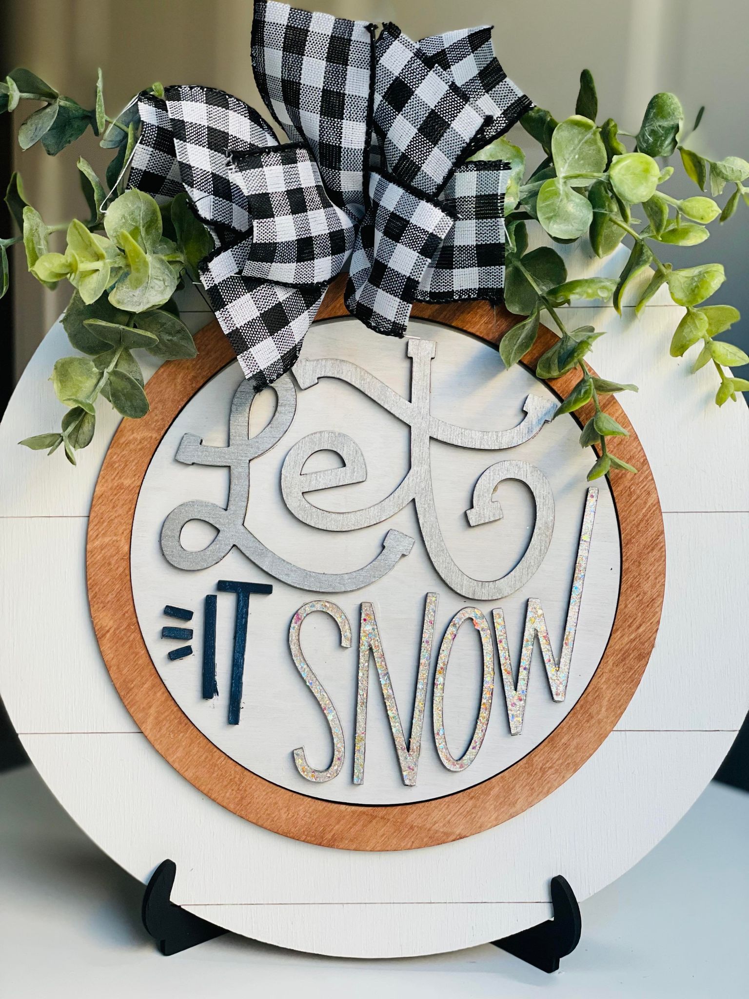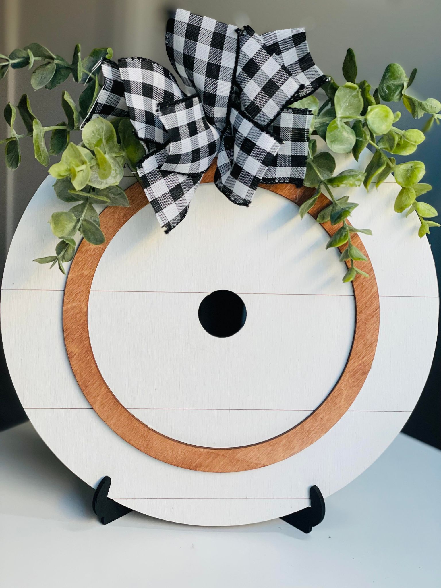 Keep something in the house that can be updated with the season or holiday. Perfect décor item for entry way, kitchen, office, you name it! It is made from 1/8" birch. It can come painted as seen here, painted in black and white only, or unpainted as a DIY project. Includes stand, greenery and a bow and (4) inserts. Additional inserts can be purchased, see the Seasonal Sign Inserts product page.