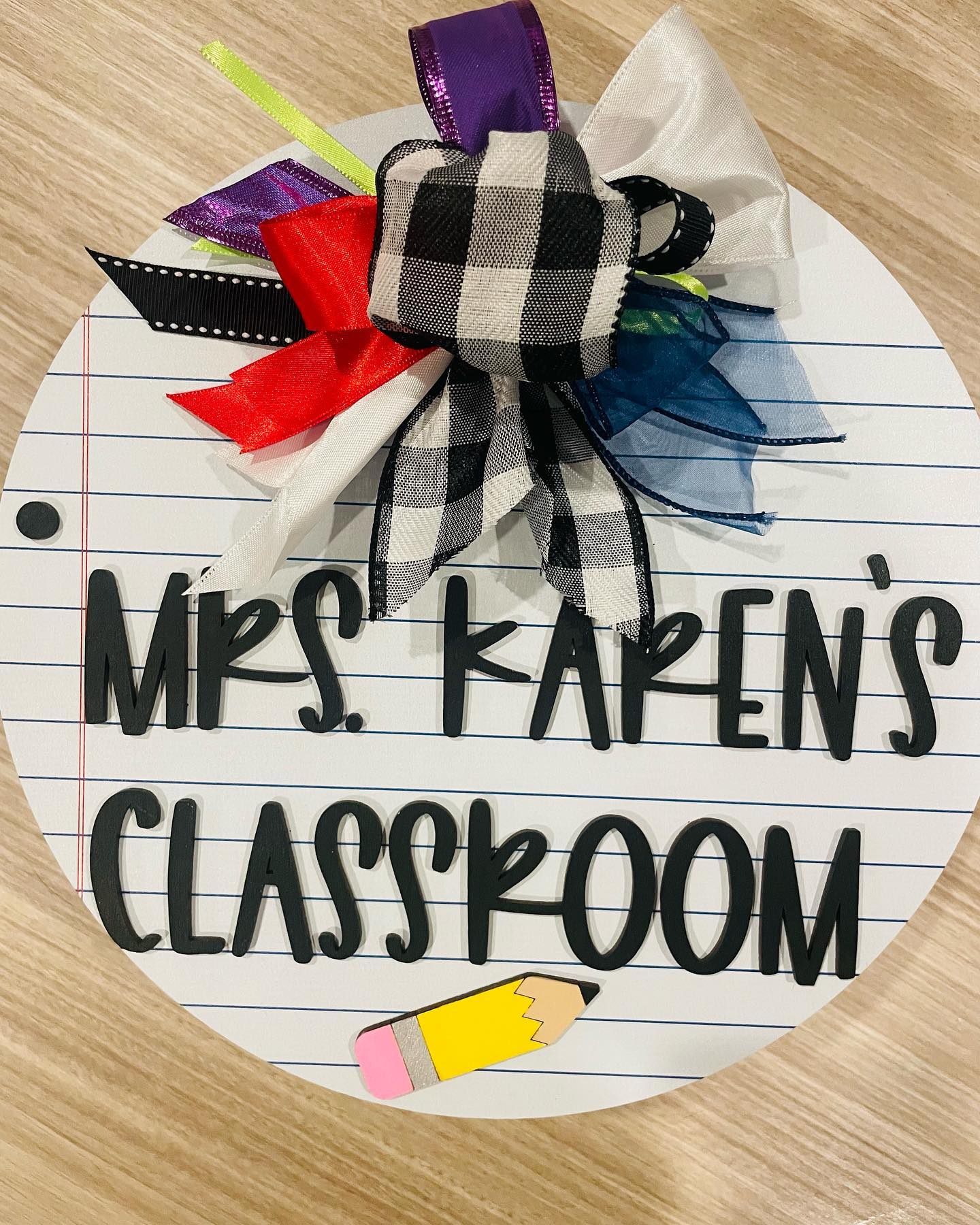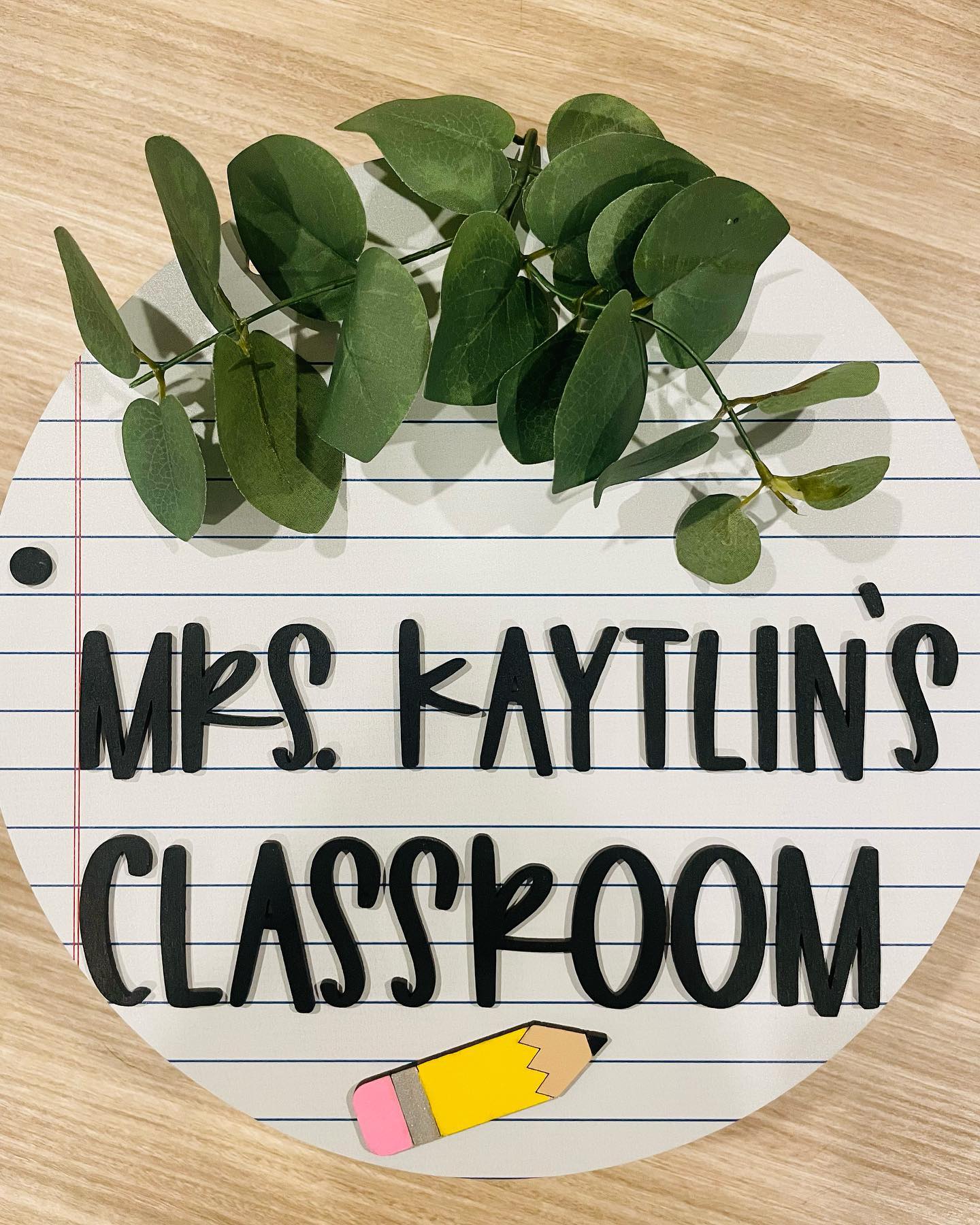 This incredibly realistic notebook sign is the perfect gift for your little one's teacher! It is made from 1/8" acrylic (round) and 1/8" birch (name). It can be decorated with either greenery or a bow.